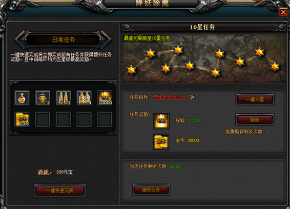降妖除魔.活动任务每日只可接取20次,每次可以通过金币刷新任务星级,也可以通知元宝一键满星,星数越高,奖励越高同时通过任务框里的“一键快速完成”可花费200元宝立即完成任务,提交任务时,也可以花费元宝领取双倍奖励。降妖除魔活动获得的奖励是非常丰厚的,大家若是想要更多的奖励可以通过花费元宝来获得,既方便快捷,还有双倍奖励获得。